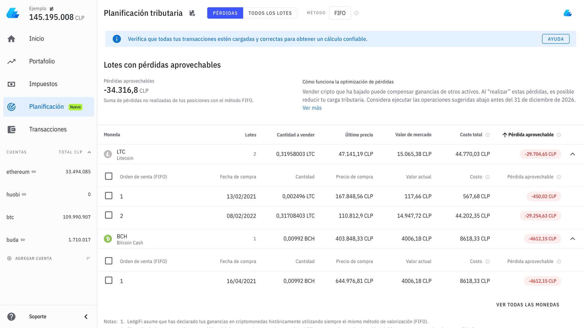 La ventaja de este nuevo apartado, es que refleja todas las pérdidas que puedes utilizar en cada una de tus criptos, por lo que podrás saber sin mayor esfuerzo qué vender en caso de que necesites vender algo y poder, de pasada, aprovechar de reducir tu carga impositiva.